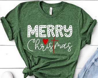 Women's Christmas T-Shirt. Features the words 'Merry Christ-mas' with a red cross and heart.